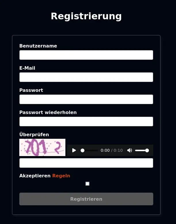 - a proper captcha for the user registration process that can be solved either by vision or by sound.